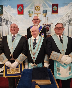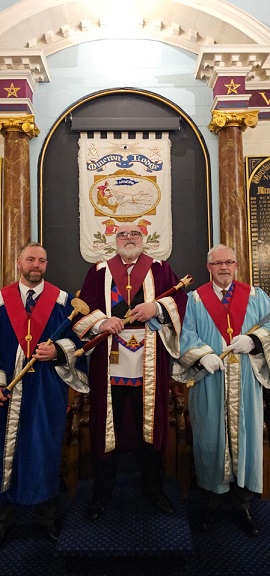 The Chapter opened in due form with E Comps Ben Kelly, Kevin Marshall and James Ashby Kelly in the Chairs of Z, H and J. Ben moved things along smartly with the assistance of his DC, E Comp Richard Theaker, and a knock at the door announced the presence of E Companion David Whittall, Provincial ADC who requested an escort for E Comp Paul Harper PGStB. Paul entered with great dignity and greeted the three Principals before being seated with them on the dais.